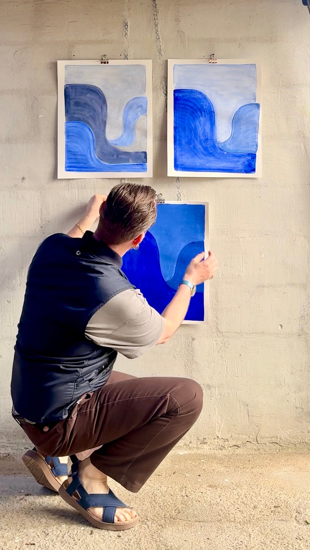 The series centres around 3 original works, inspired by the colour names from Shangies' new Unisex2 sandals: Dune Diver, Rebel Ranger, Wave Walker (acrylics on 40x50cm paper). In addition the exhibition includes 6 further 40x50cm originals, as well as a selection of sketches and colour studies, mounted on coloured paper.