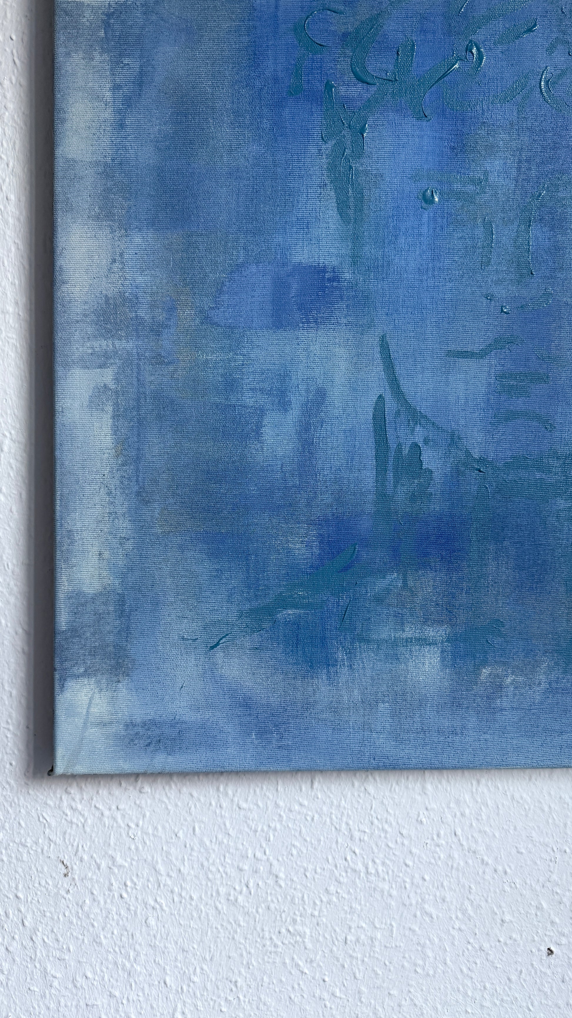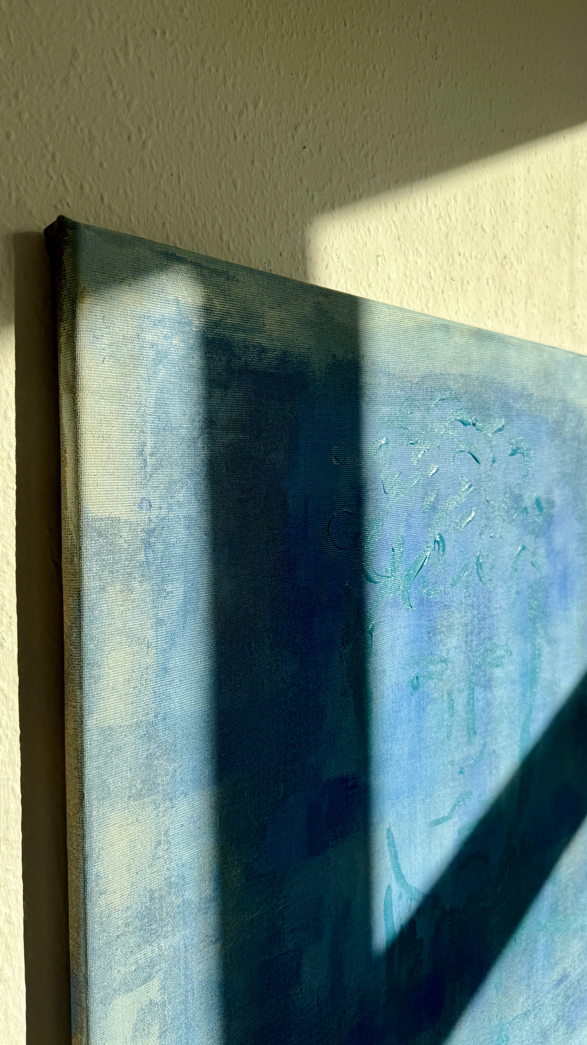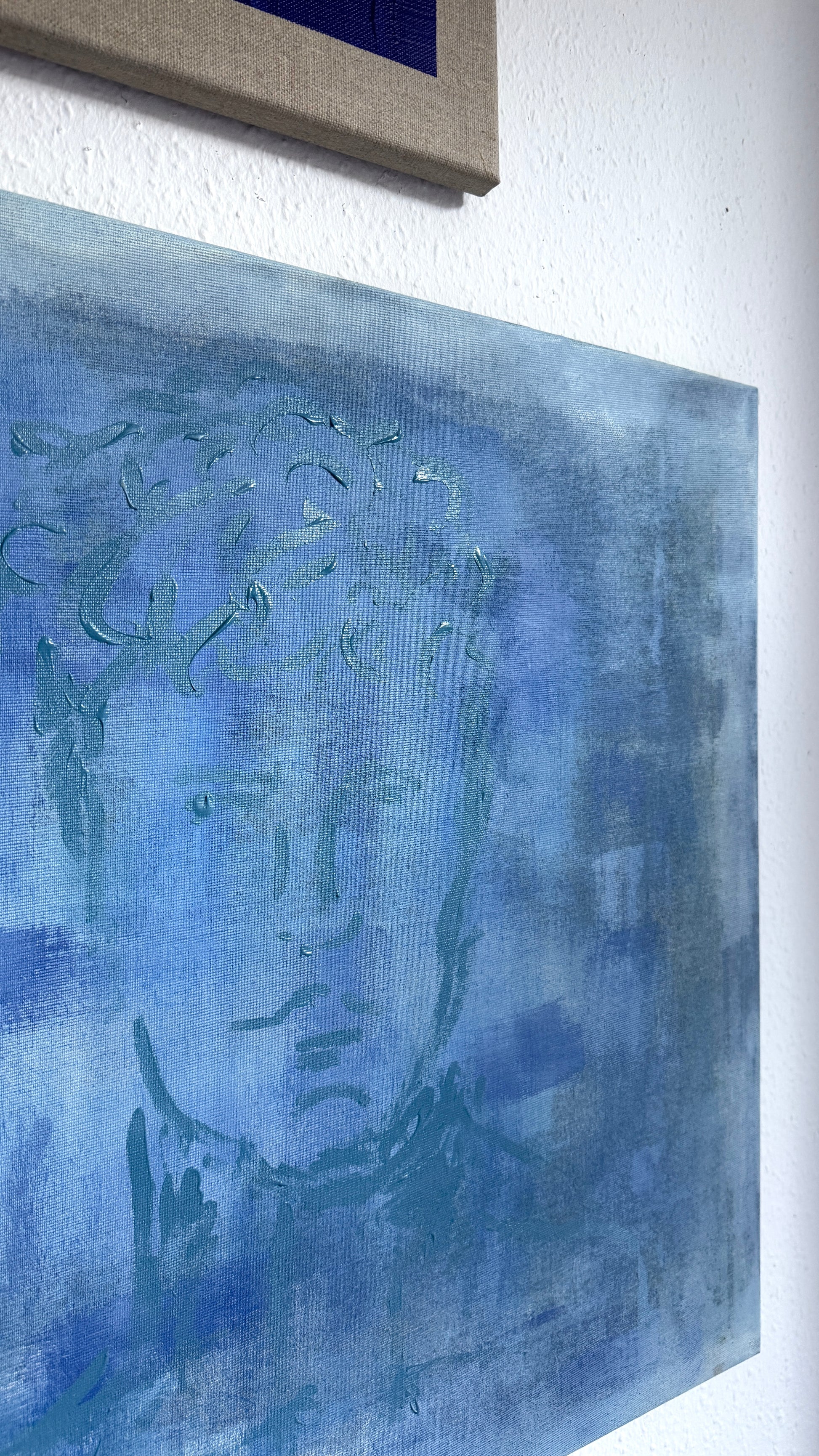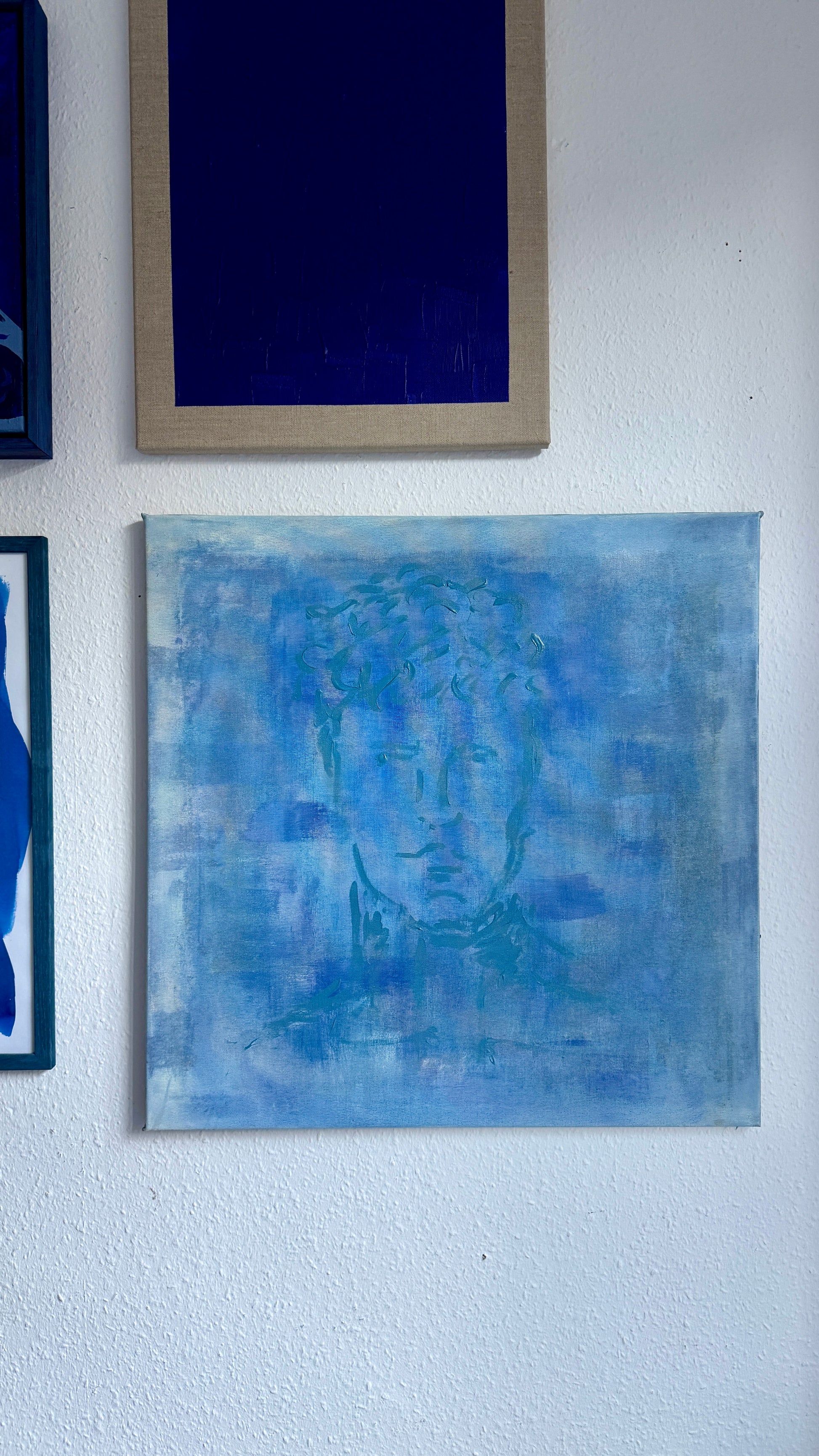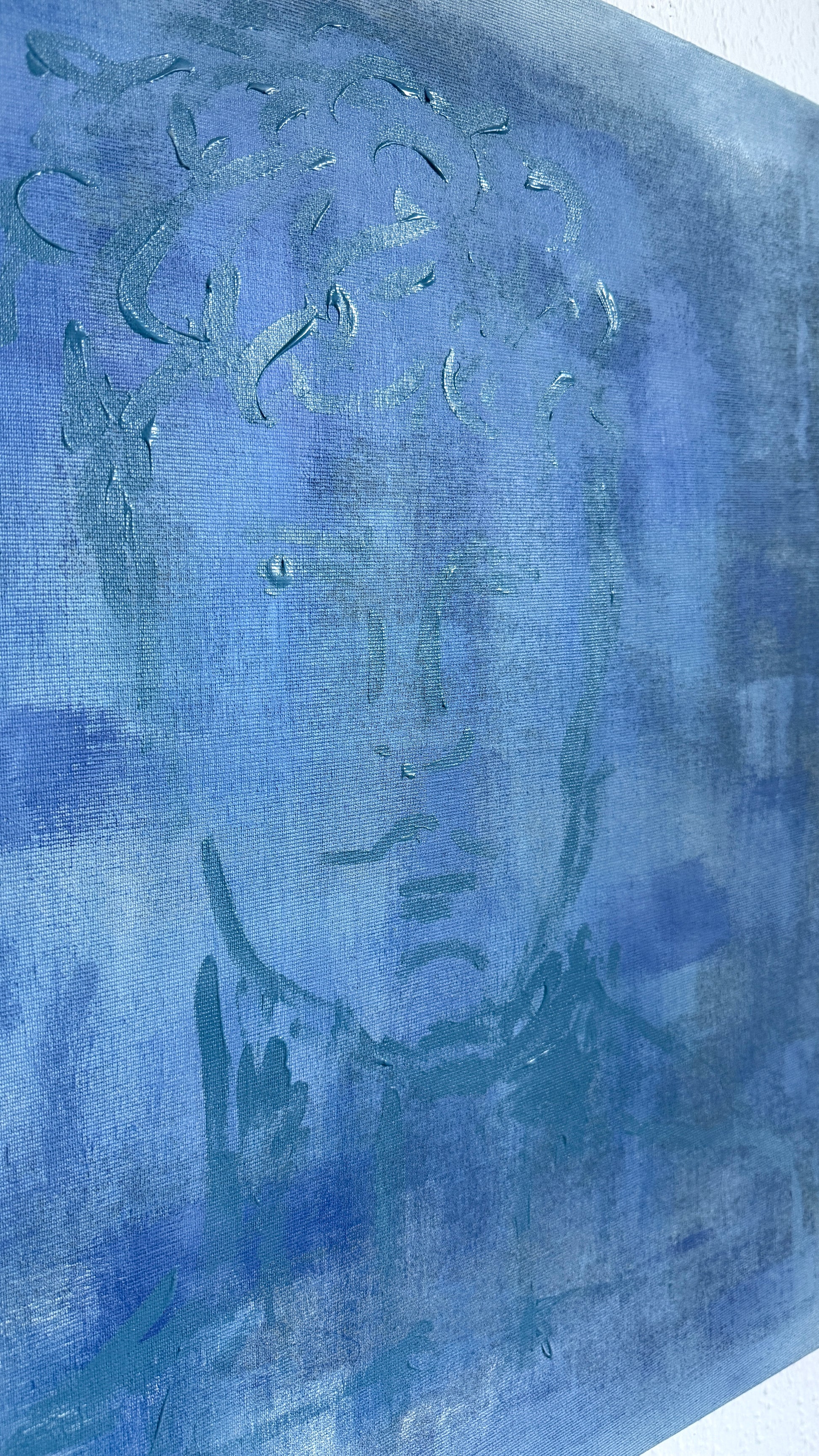 A quiet portrait emerging through layers of muted blues and soft light — as if seen through fog, memory, or a half-open window.
