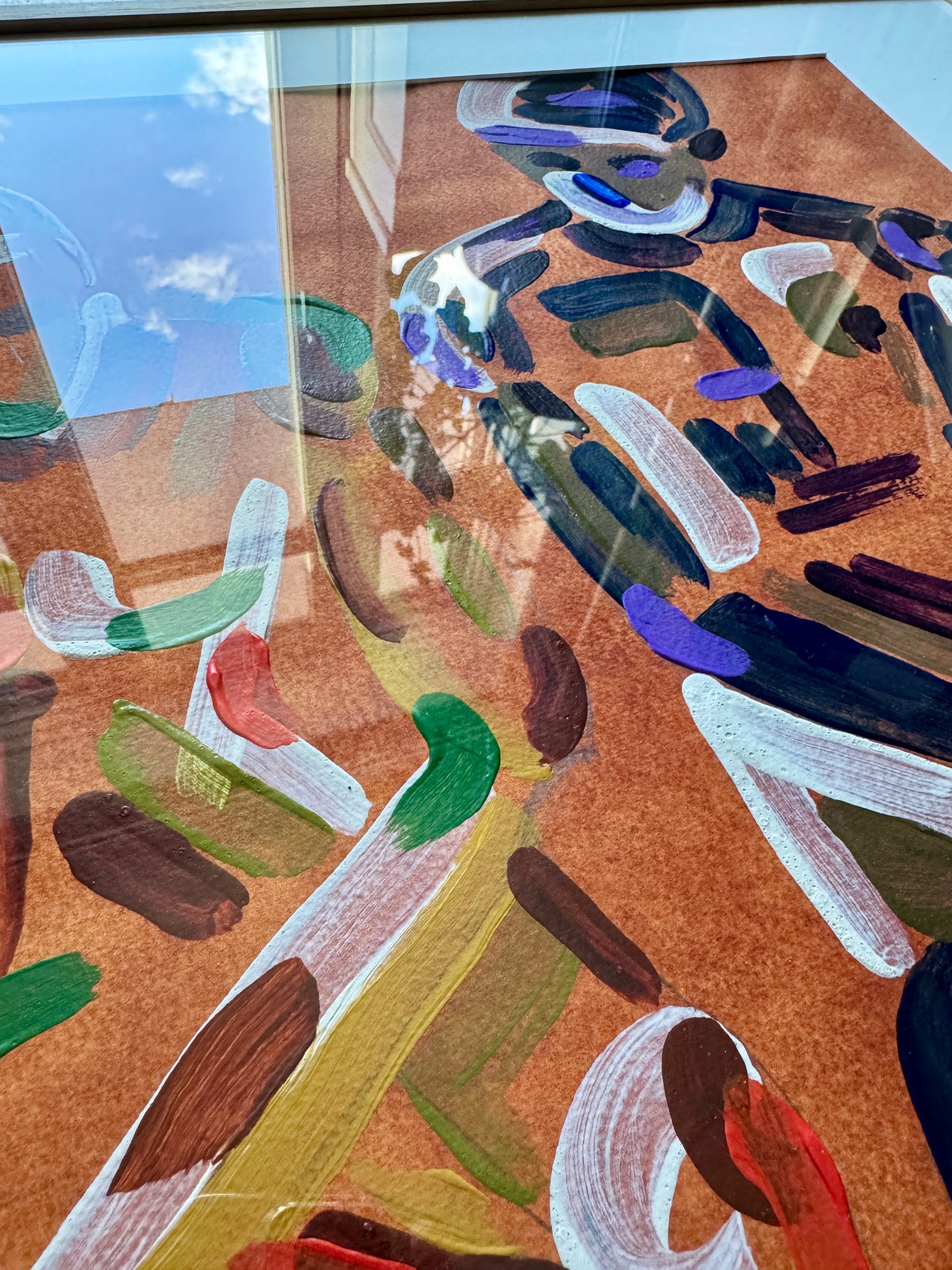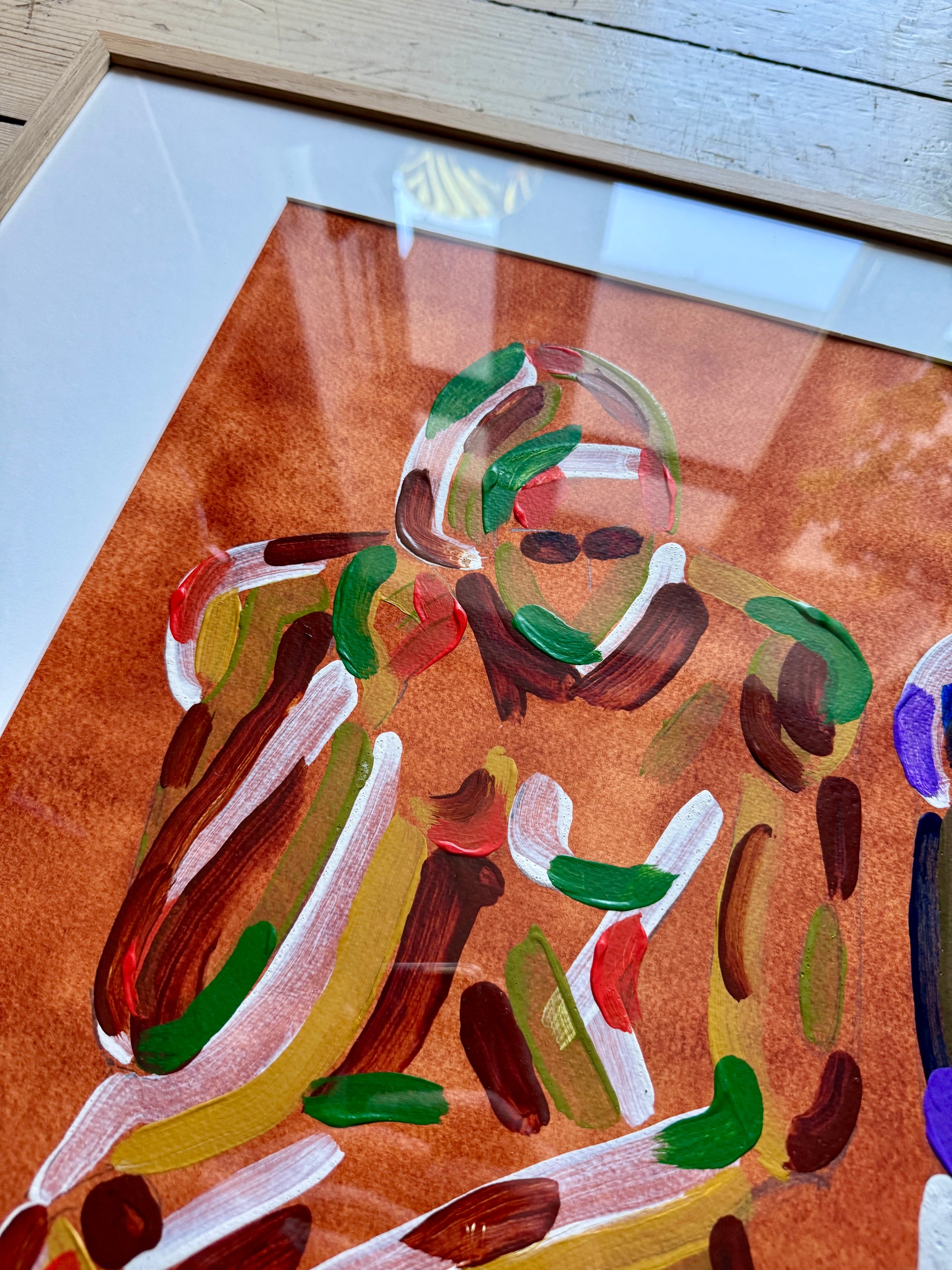 The warm terracotta background meets layered brushstrokes in green, violet, and white, forming a dialogue between individuality and togetherness.