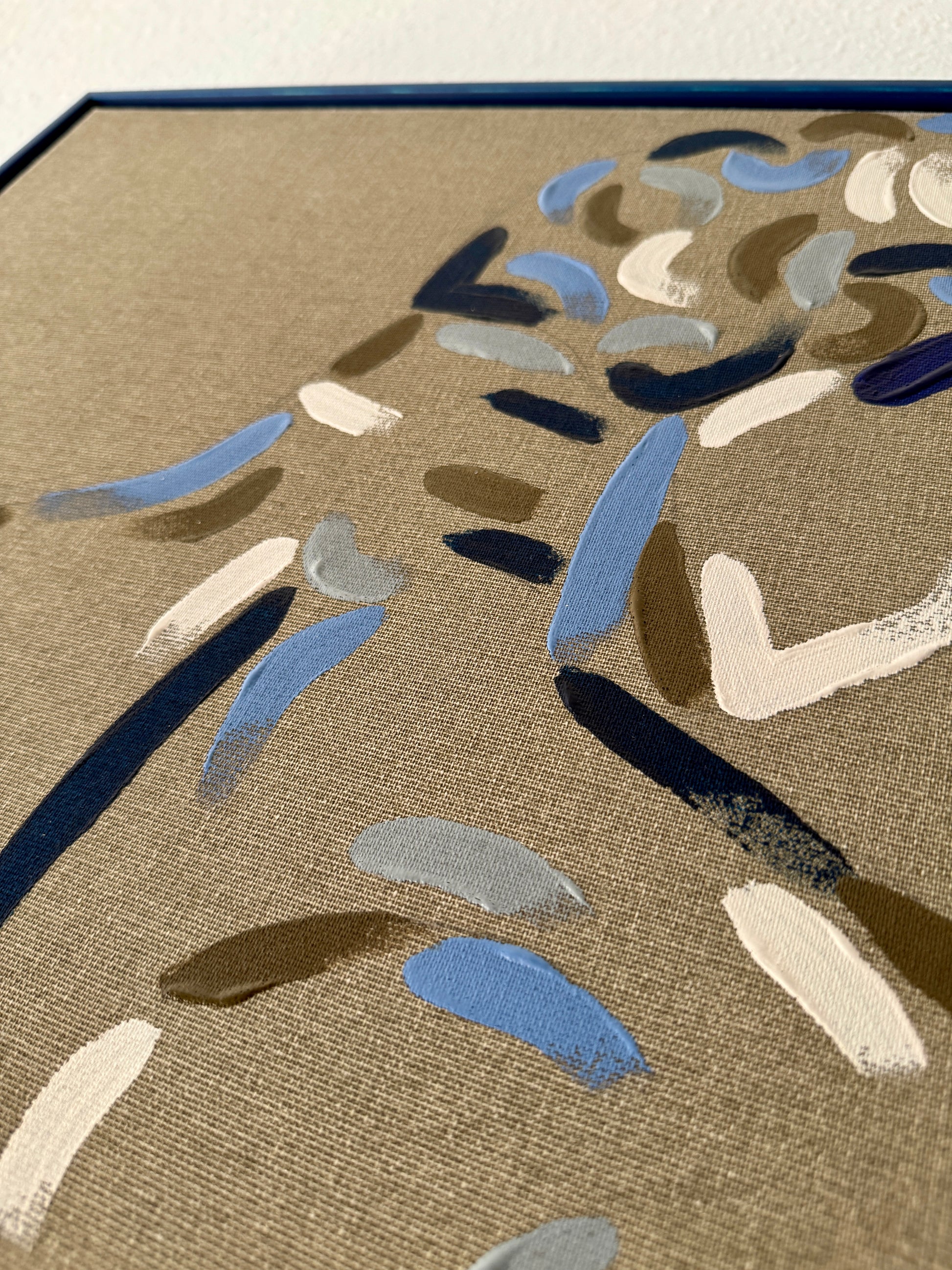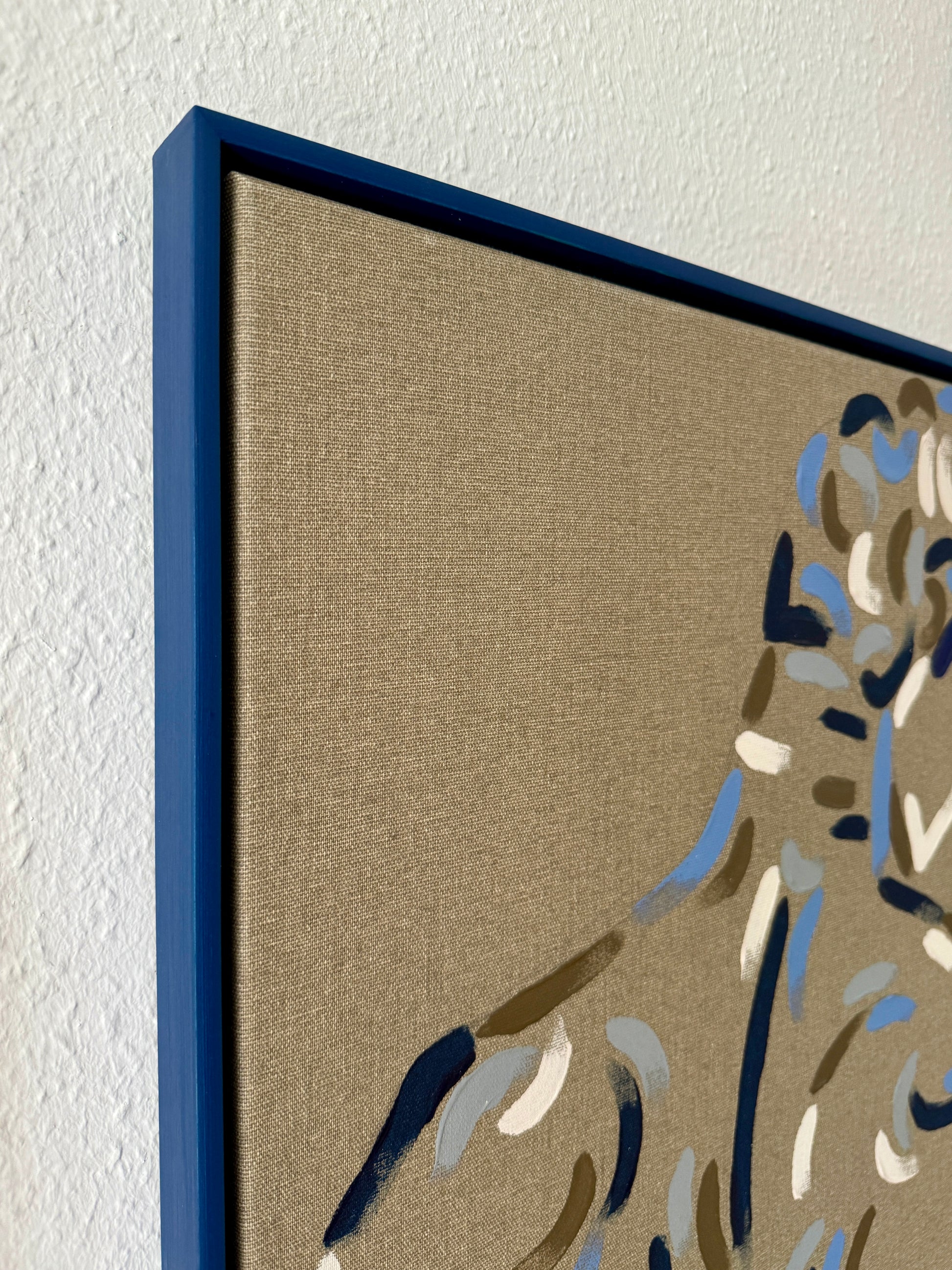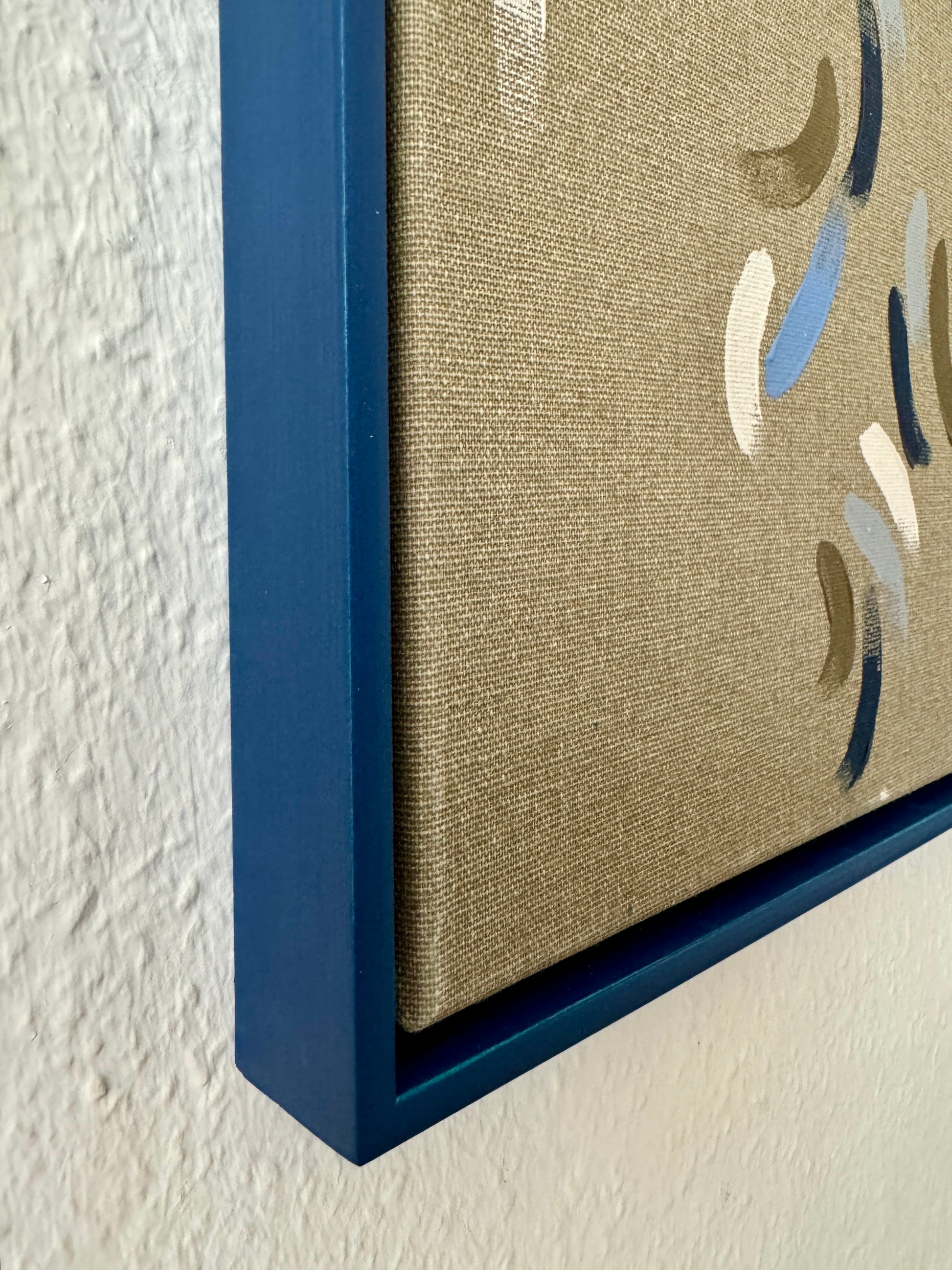 Framed in dark blue, hand-stained beech floating frame