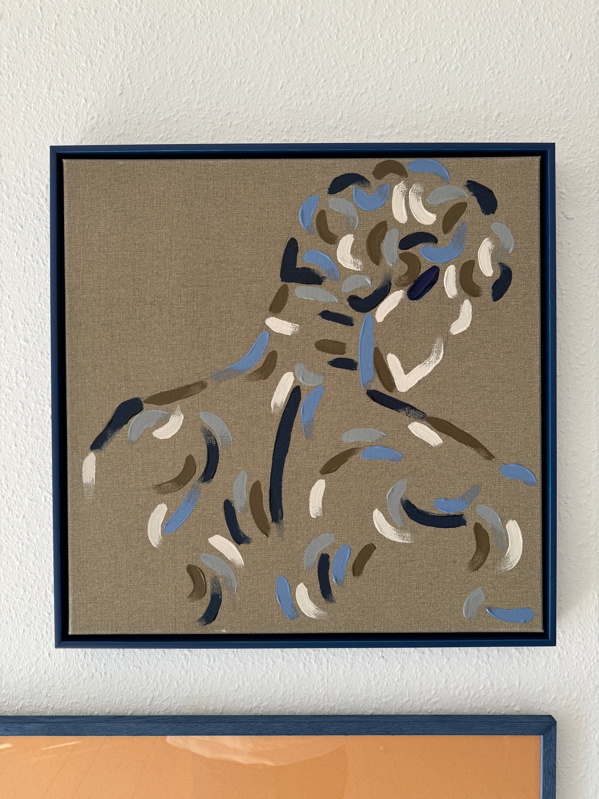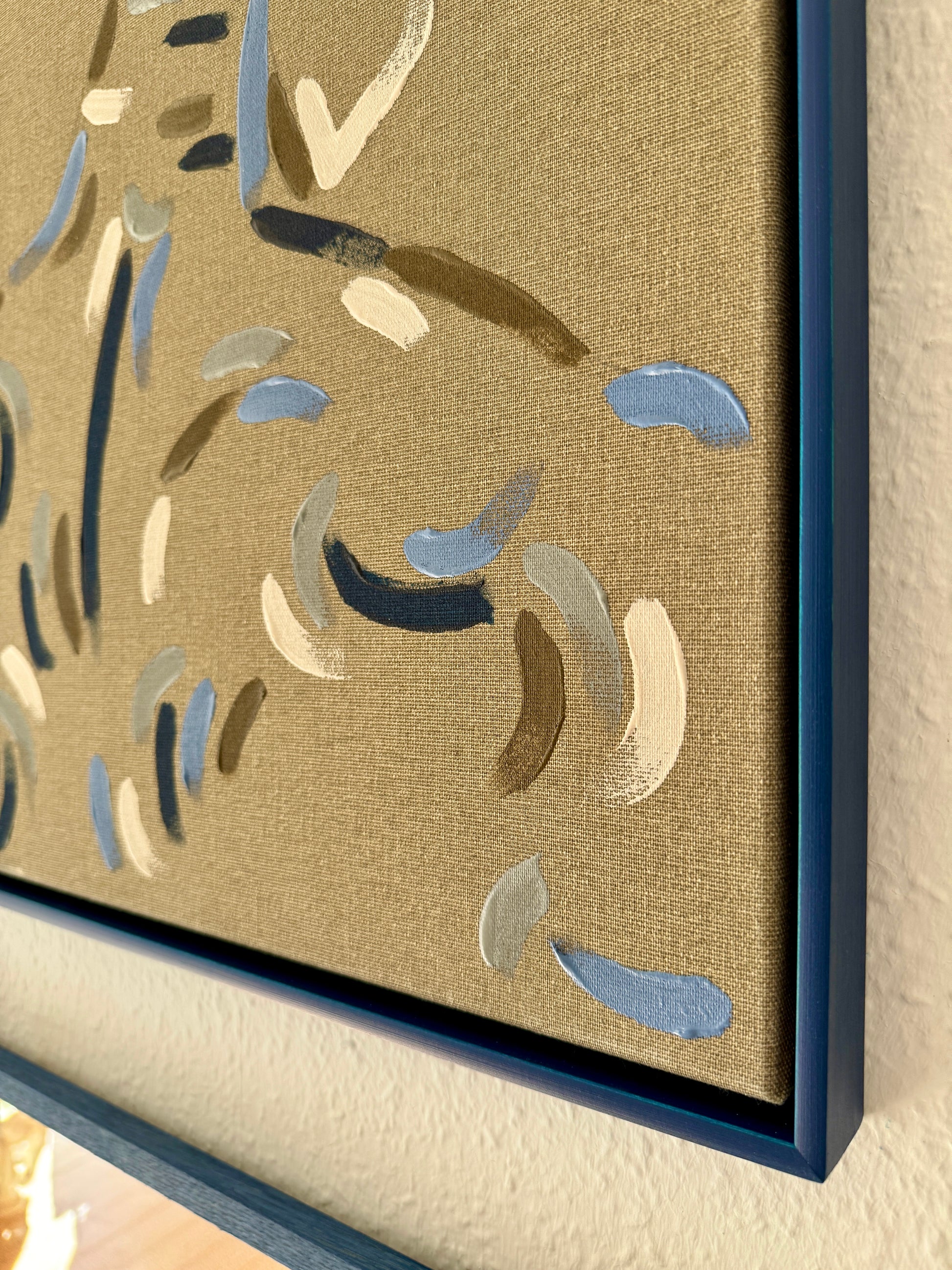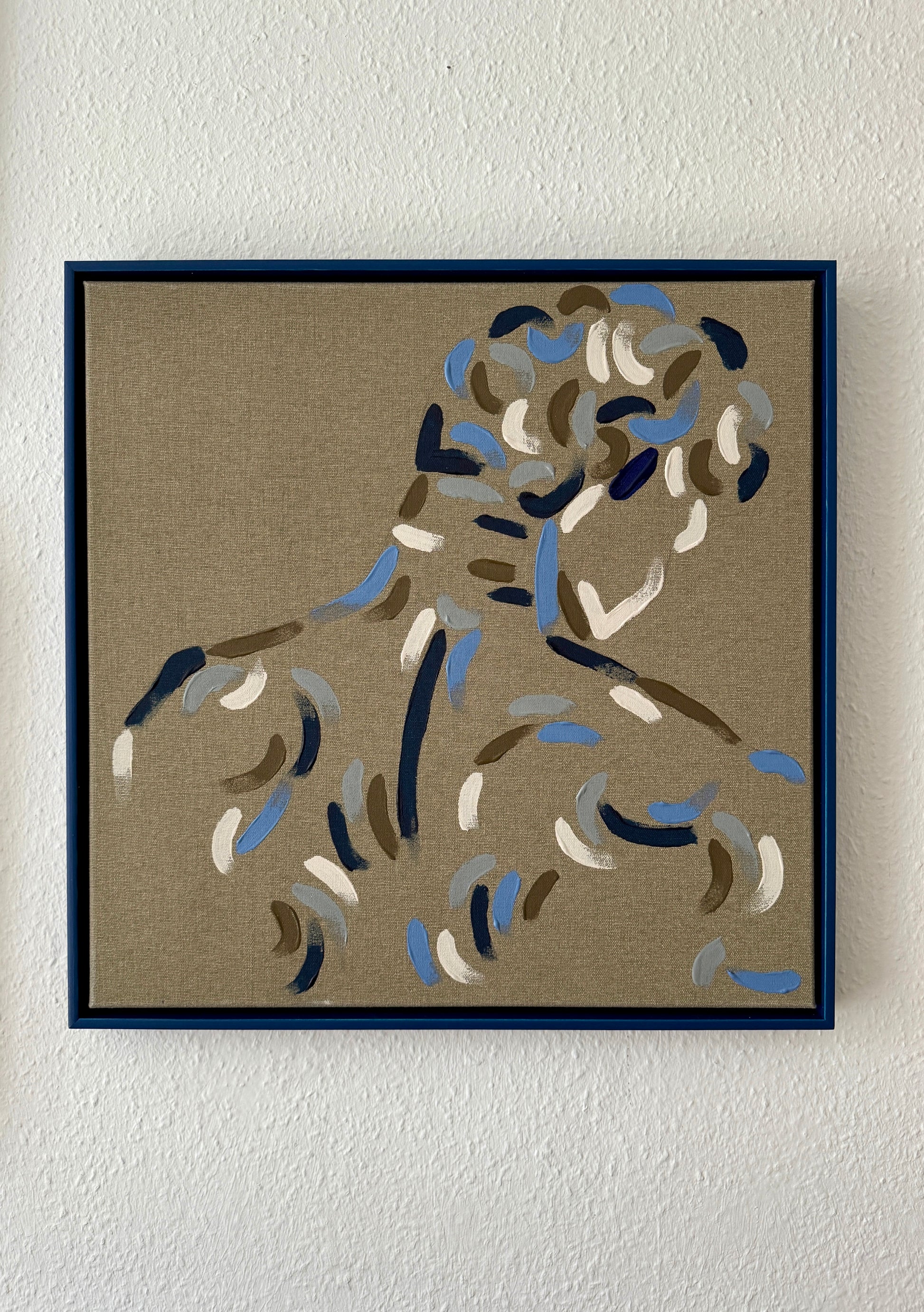 Framed in dark blue, hand-stained beech floating frame