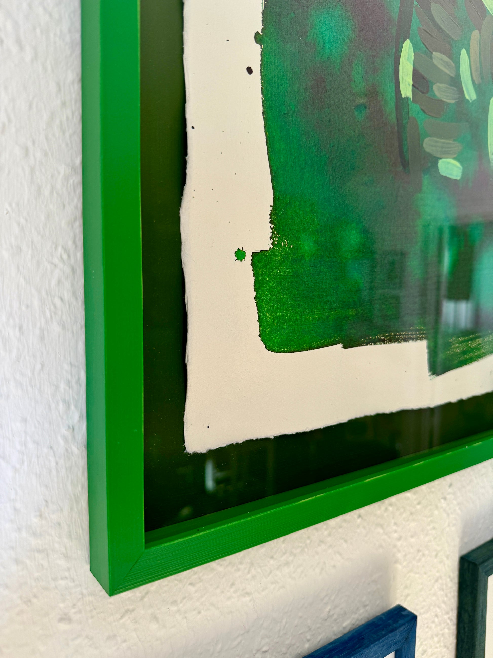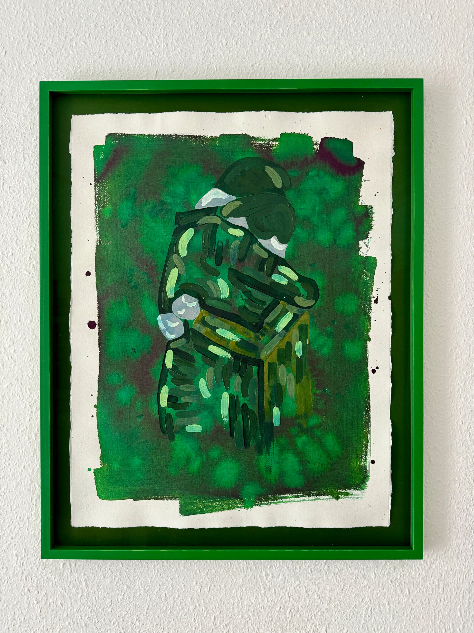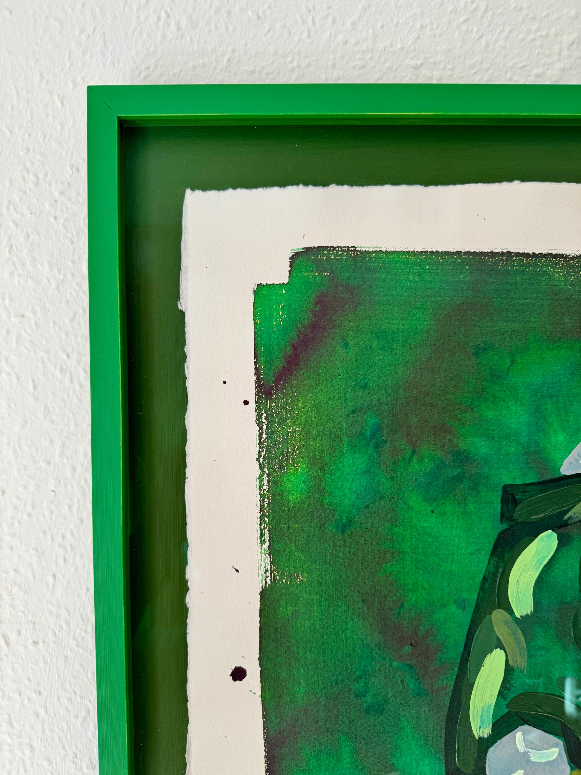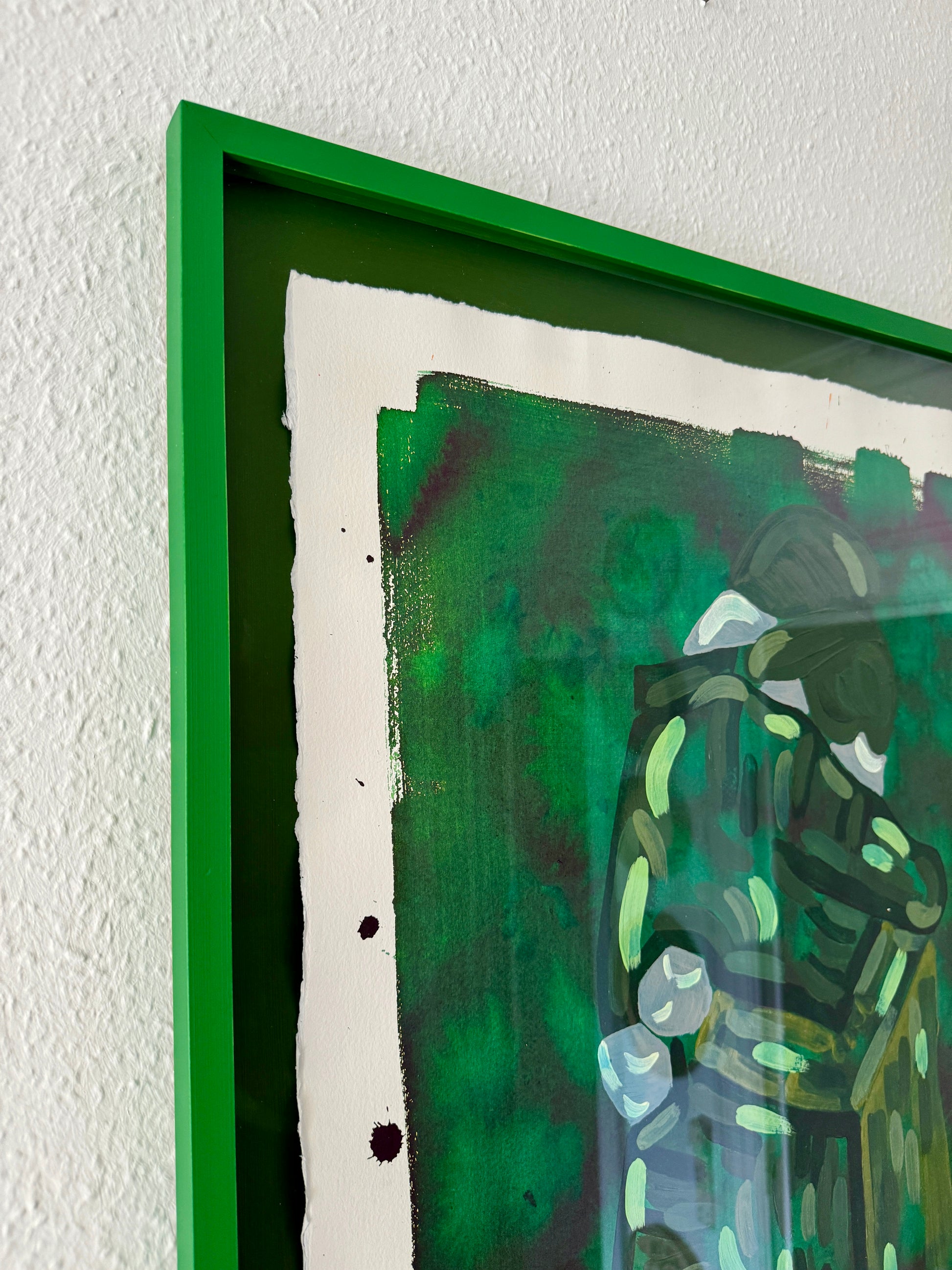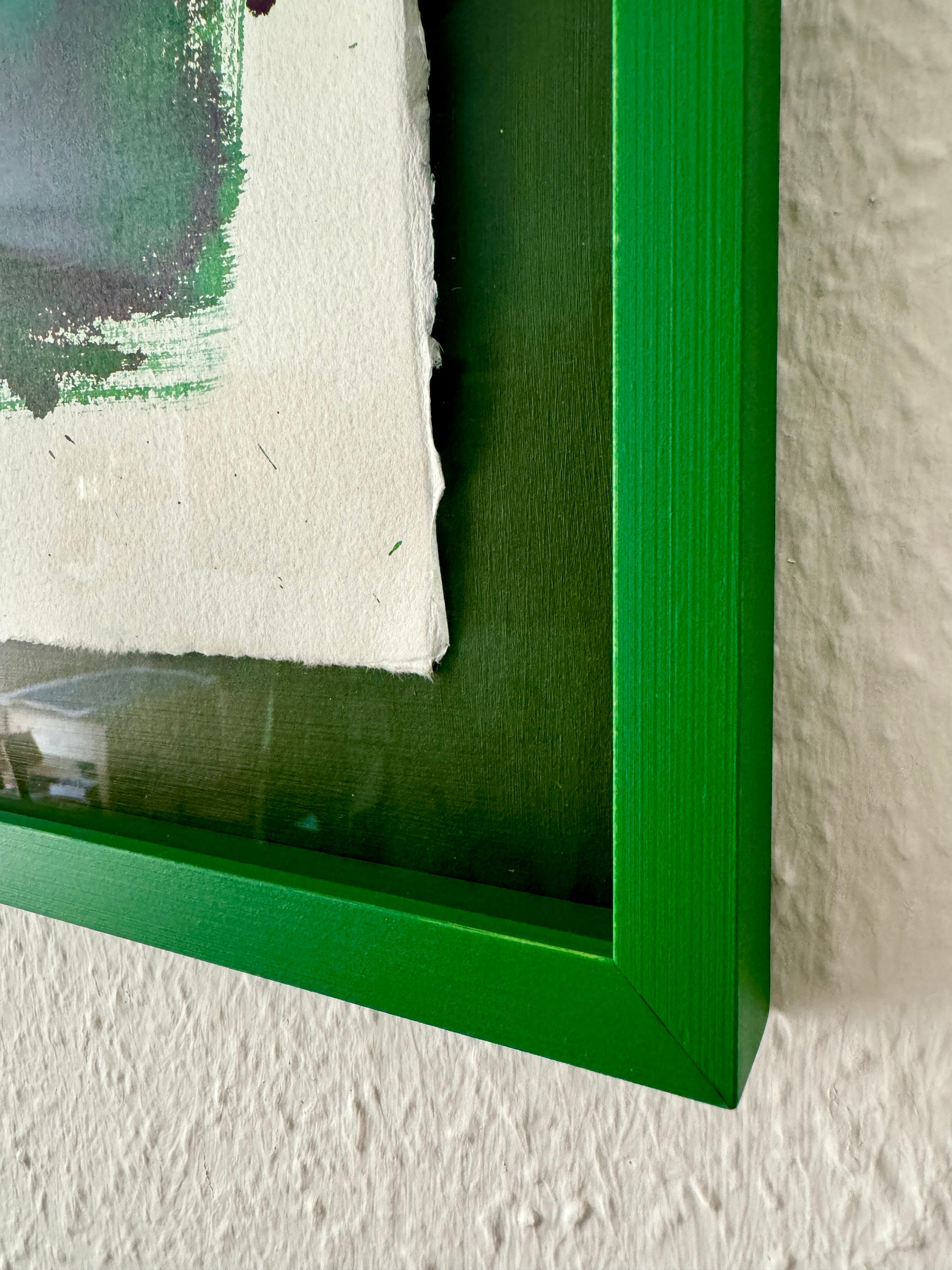 The original is floating in the frame, with back carton, inside distance list and frame all hand painted, each in their own shade of green. To enhance the multi colored green piece, it's framed with museum glass to further enforce the visibility of the rich shades of the painting.