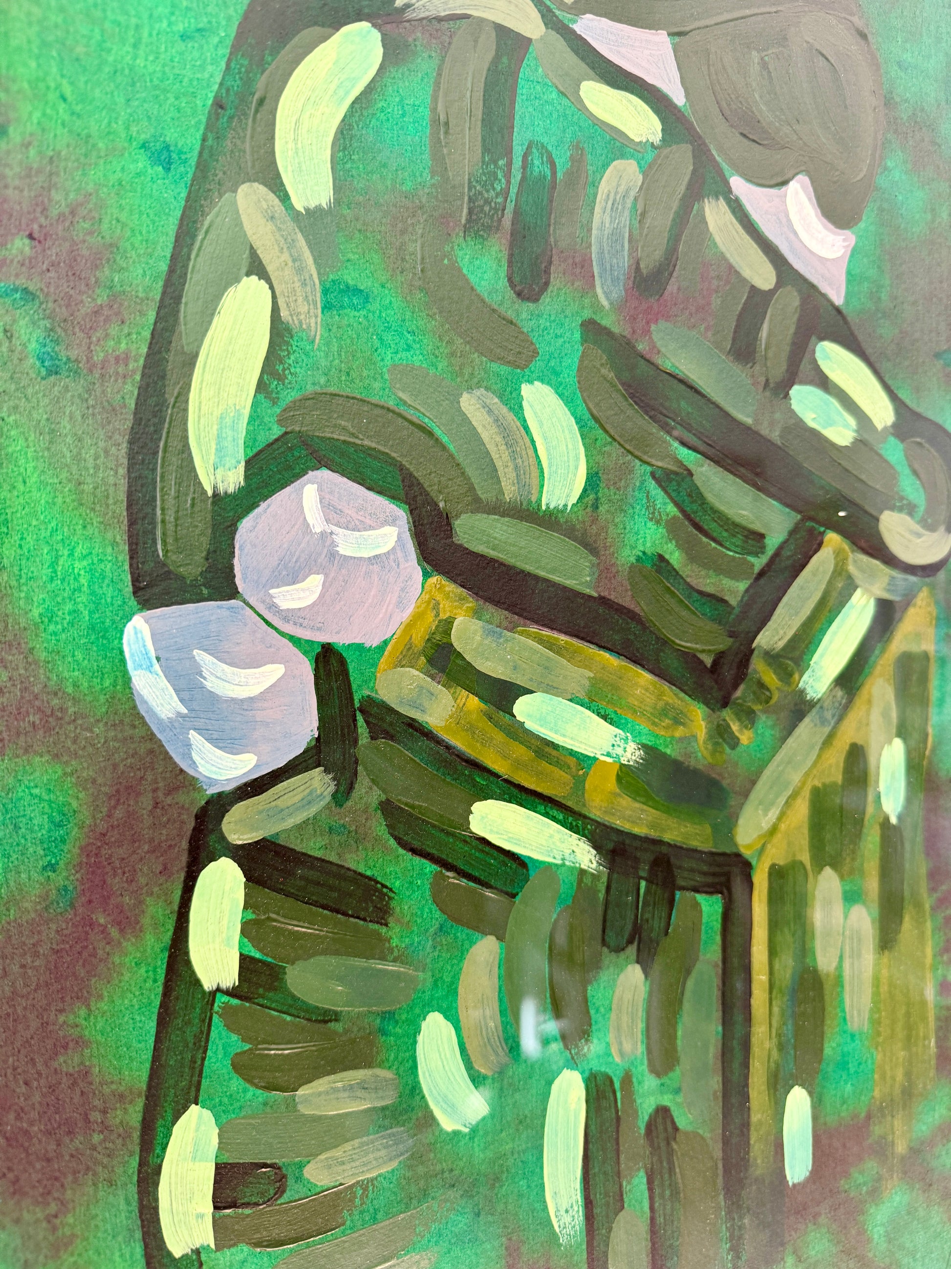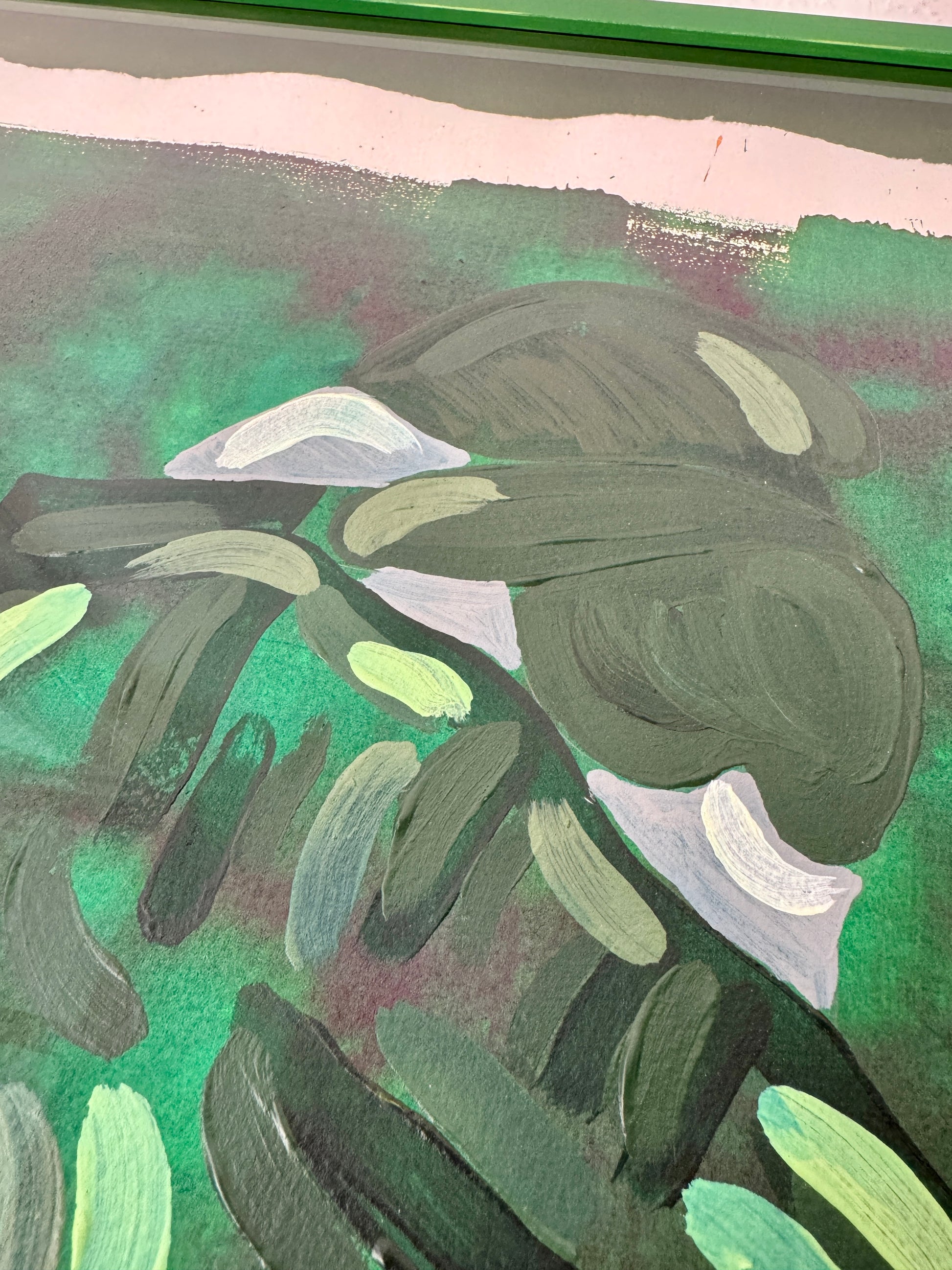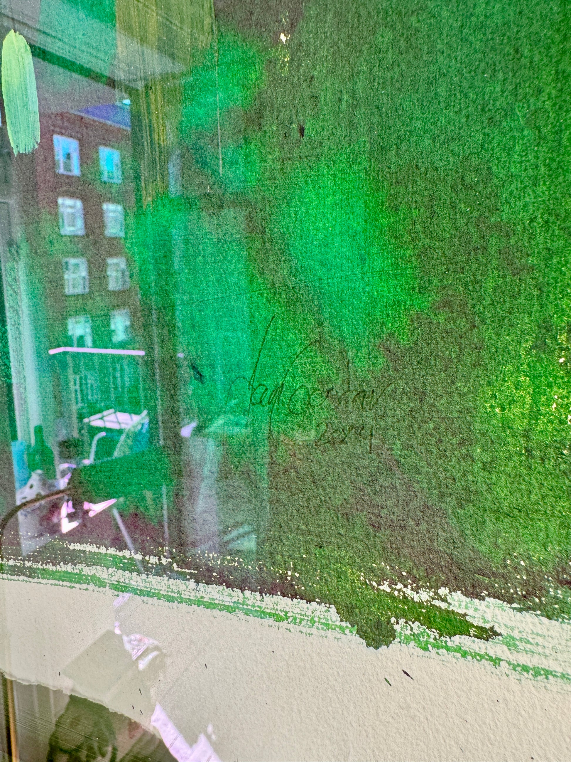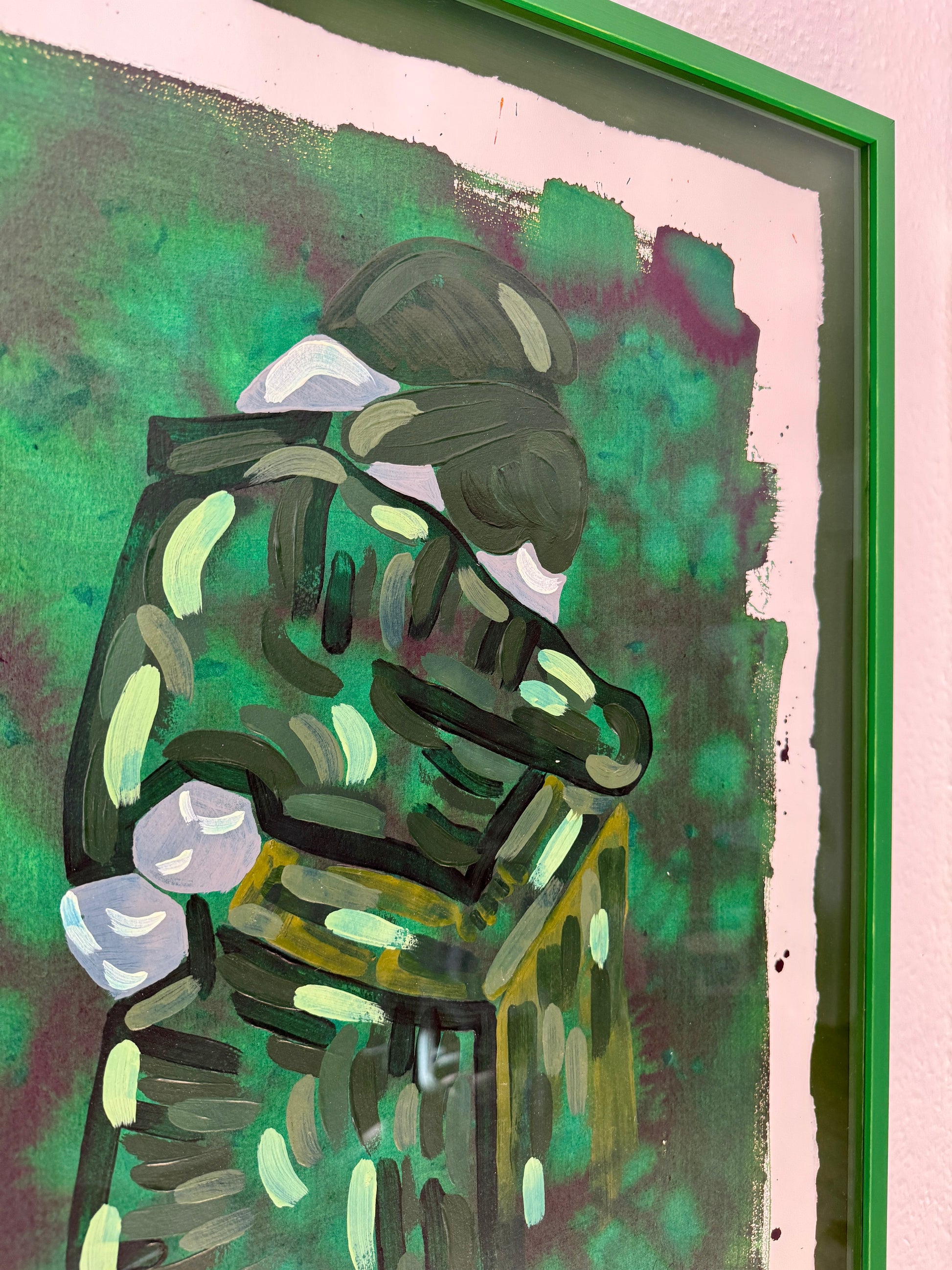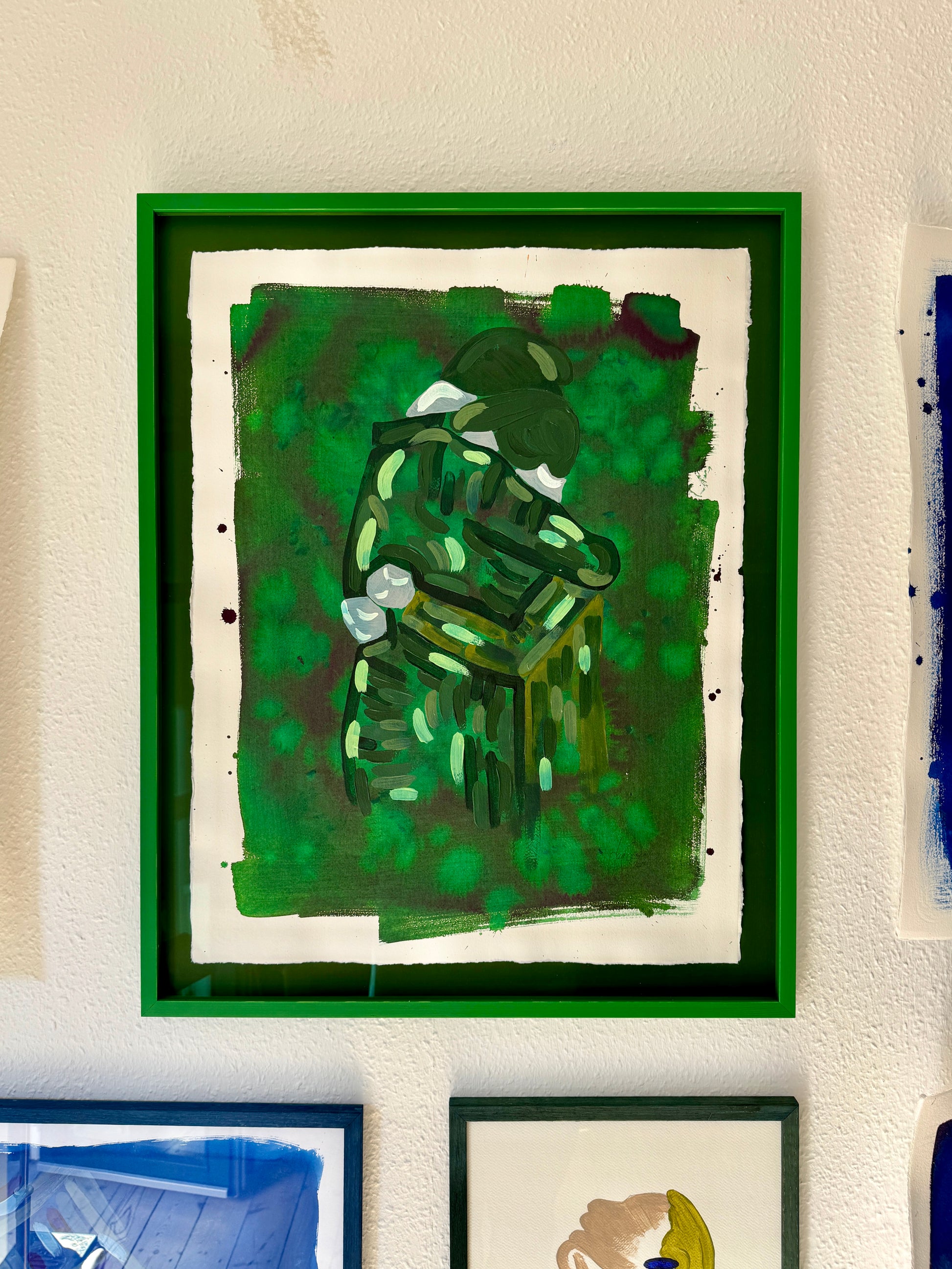 The original is floating in the frame, with back carton, inside distance list and frame all hand painted, each in their own shade of green. To enhance the multi colored green piece, it's framed with museum glass to further enforce the visibility of the rich shades of the painting.